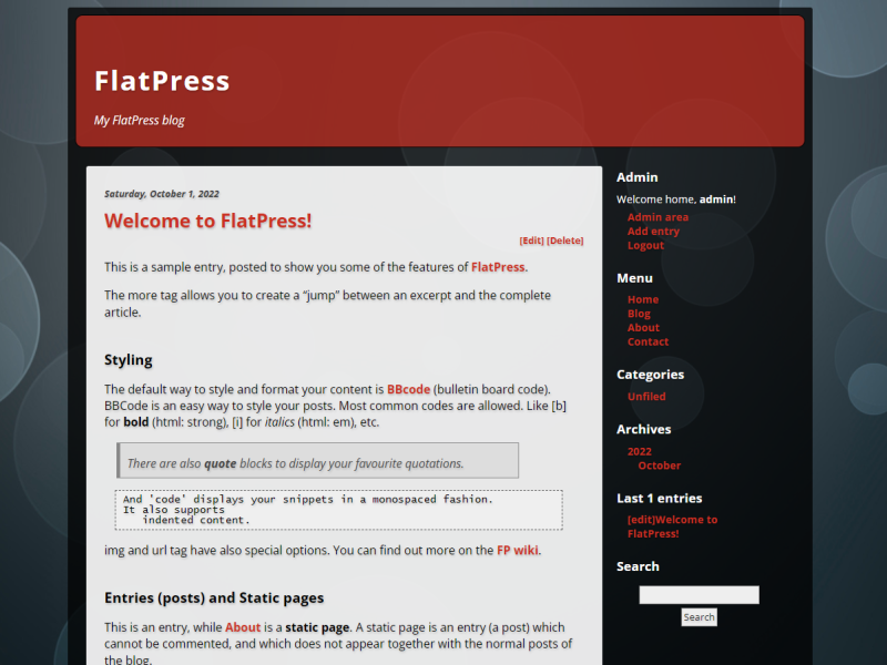 - Menü (Der Inhalt dieser statischen Seite taucht auch in der Seitenleiste deines Blogs auf - das ist die Magie des Blockparser-Widgets. Das FlatPress-Wiki hat Informationen dazu, und noch viel mehr!)